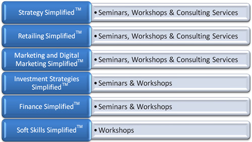 All our training programs & consulting services are Simplified. The outputs that you will have will be 2 to 4 page simplified solutions with execution plan, unlike most consulting organizations that bombard you with 50 to 100 slides presentations or 50 to 100 page reports loaded with heavy management jargons, their internally coined jargons, complex charts, graphs, matrixes.